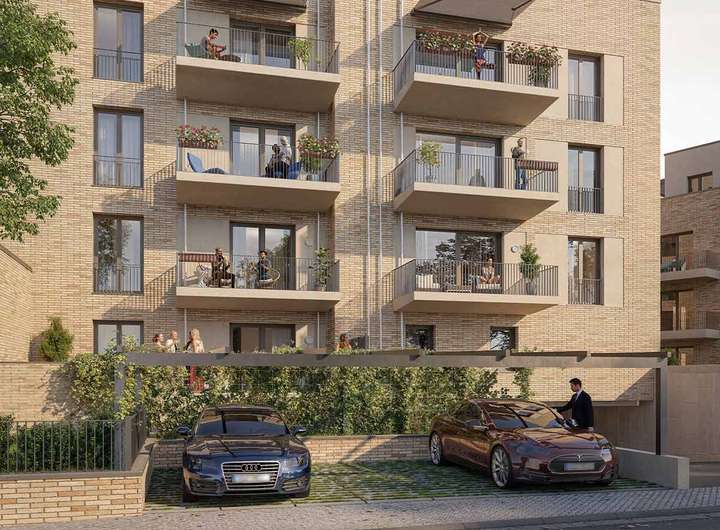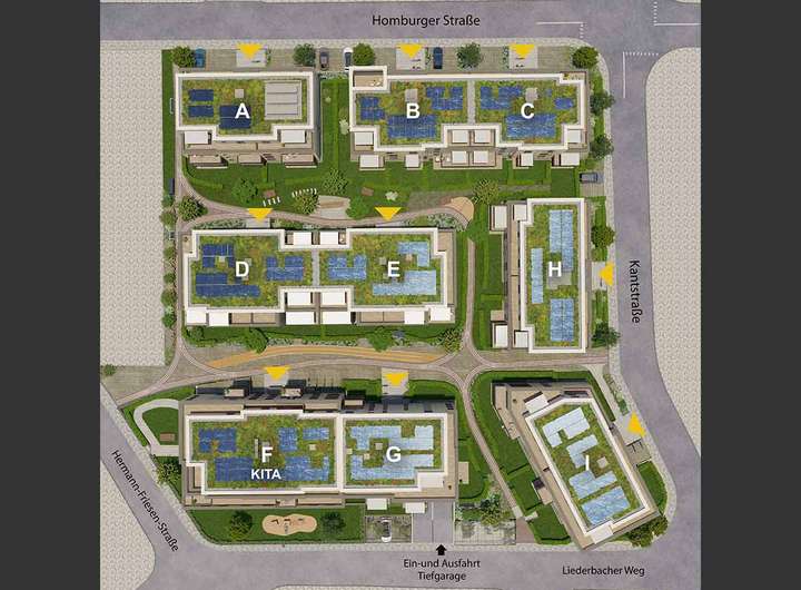 • Elektromobilitätskonzept: Mehr als 50 % der Stellplätze verfügen über eine Wallbox mit bis zu 11kW mittels Lastenmanagement