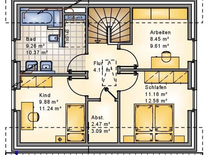 Unser AMR-Satteldachhaus gehört seit Jahrzehnten zu den beliebtesten Haustypen und überzeugt durch ein hervorragendes Preis-Leistungs-Verhältnis. Dank langjähriger Erfahrung und optimierter Bauprozesse bietet es eine ideale Kombination aus Wohnkomfort und Wirtschaftlichkeit. Besonders junge Familien schätzen die flexiblen Raumkonzepte, die optimale Nutzung der Dachschrägen sowie den großzügigen Dachboden mit Ausbaureserve.