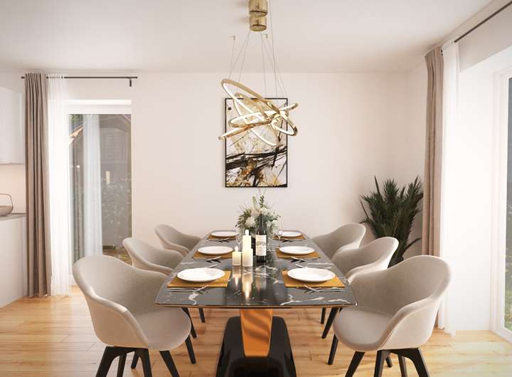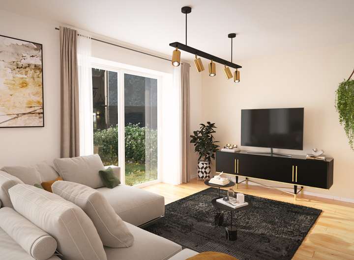 Bereits beim Betreten des Hauses begrüßt Sie ein heller Eingangsbereich mit einem praktischen Tageslicht-Gäste-WC, einem Abstellraum sowie Platz für Ihre Garderobe. Der großzügige Wohn- und Essbereich mit offener Küche bildet das Herzstück des Hauses. Bodentiefe Fenster sorgen für viel Licht und bieten gleich drei Zugänge zum sonnigen, eigenen Garten – perfekt für gemütliche Stunden im Freien. Ein angrenzender Vorratsraum schafft zusätzlichen Stauraum.