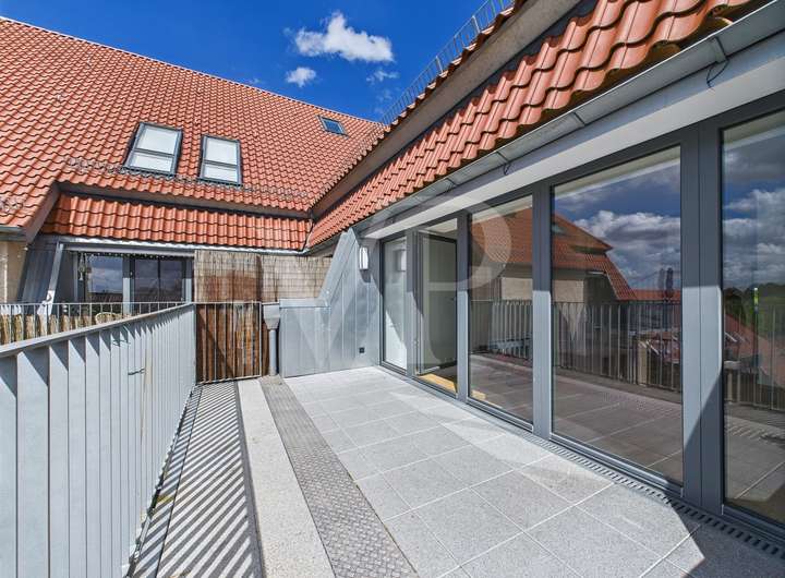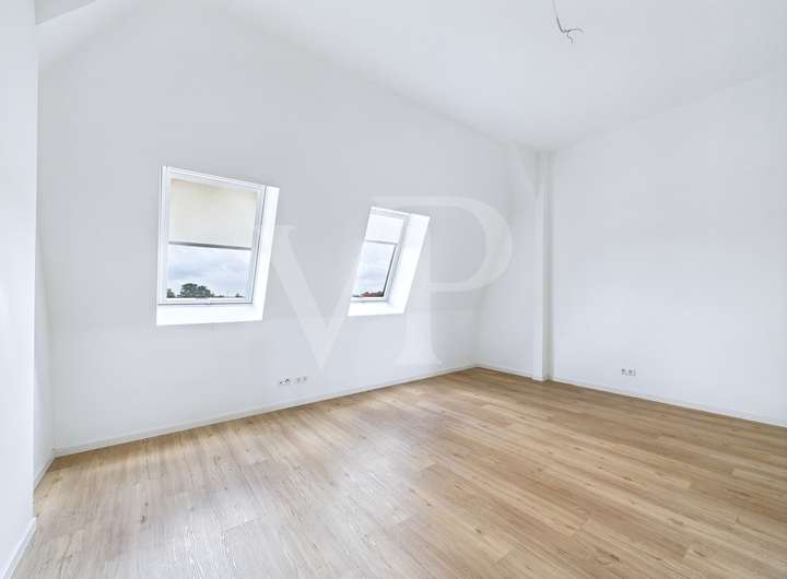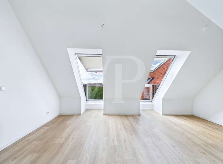 Im Dachgeschoss befindet sich der großzügige Wohn- und Kochbereich, der mit seinem offenen Grundriss viel Raum für persönliche Wohnideen lässt. Die große Fensterfront sorgt für ein helles und freundliches Ambiente. Ebenfalls auf dieser Ebene befinden sich ein weiteres Zimmer, das sich ideal als Schlafzimmer oder Homeoffice eignet, sowie ein modernes Gäste-WC, ein praktischer Hauswirtschaftsraum mit Waschmaschinenanschluss und ein zentral gelegener Flur. Das absolute Highlight dieser Ebene ist jedoch der großzügige Balkon – ein exklusiver Rückzugsort mit