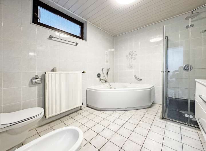 Das Badezimmer, ebenfalls im Jahr 2023 vollständig saniert, präsentiert sich in einem eleganten, zeitlosen Design mit hochwertigen Armaturen, stilvollen Fliesen und einer durchdachten Raumaufteilung. Hier wurde besonderer Wert auf Komfort, Funktionalität und eine hochwertige Materialauswahl gelegt, wodurch ein Ort der Entspannung und des Wohlbefindens entstanden ist.