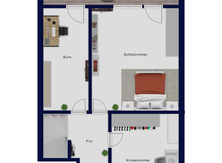 Im Obergeschoss liegt das Elternschlafzimmer mit Balkon und Blick ins Grüne. Auch das Arbeitszimmer bietet einen Zugang nach draußen – eine angenehme Möglichkeit für kleine Pausen an der frischen Luft. Ergänzt wird die Etage durch ein Kinderzimmer und ein Vollbad.