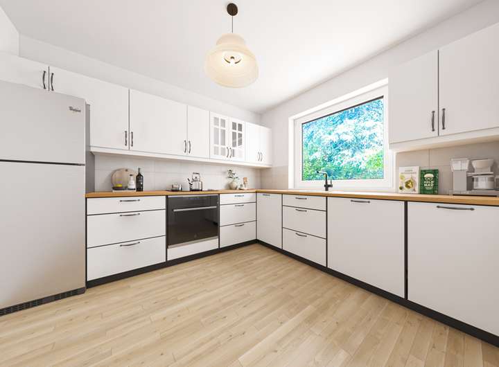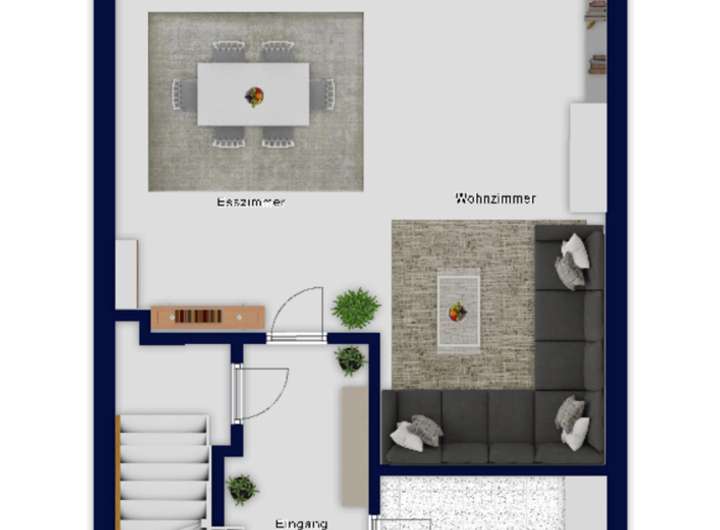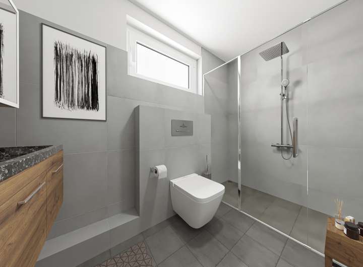 Im Erdgeschoss befinden sich zur Linken ein Gäste-WC und zur Rechten eine separate Küche, gut geeignet für alle, die kurze Wege und eine strukturierte Aufteilung im Alltag schätzen. Der großzügige Wohn- und Essbereich im hinteren Teil des Hauses bietet direkten Zugang zur teils überdachten Terrasse und in den Garten. Hier entsteht Raum für Familienzeit und gesellige Abende.