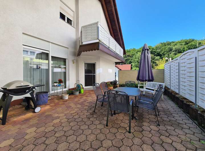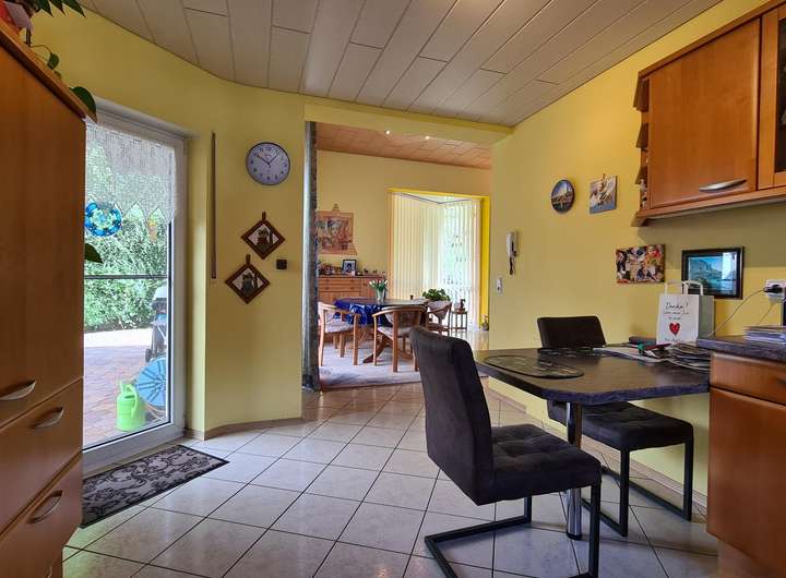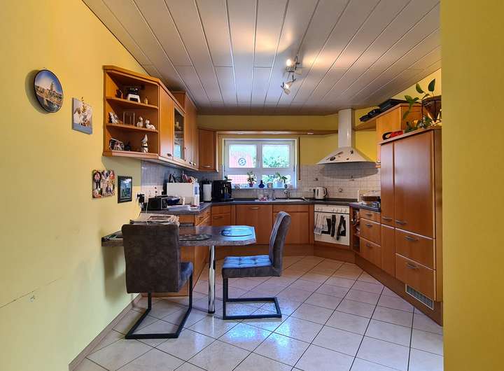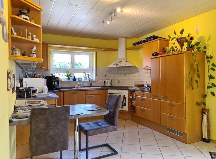 Auch von der großen zum Wohn-Essbereich offenen Wohnküche gelangt man durch eine Fenstertür ebenfalls ebenerdig auf die große sonnenbeschienene Südwestterrasse.