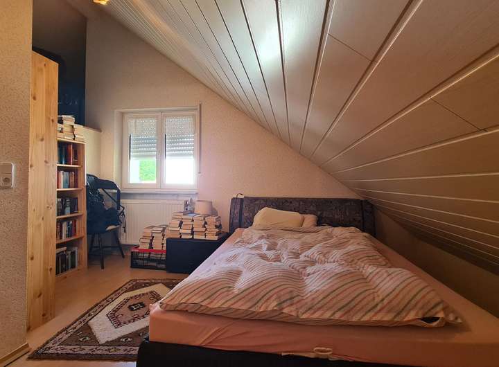 - Dachschrägen sind mit Spanplatten und weißen Holzpaneelen verkleidet.