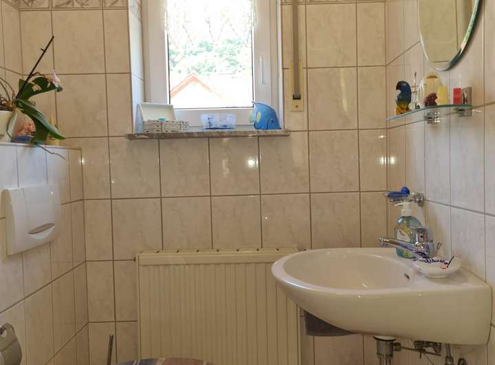 - helle Keramikfliesen in Küche, Wohn-Ess-, Flur-/Dielenbereichen sowie in Bad und Gäste-WC