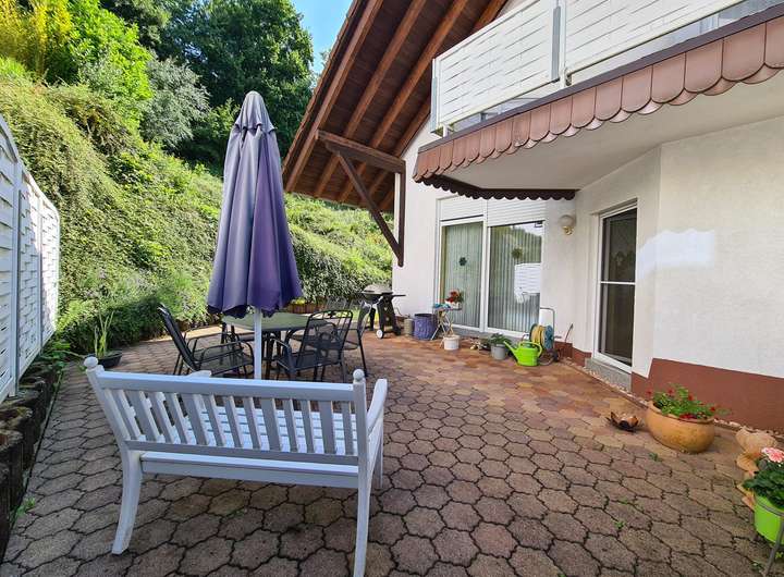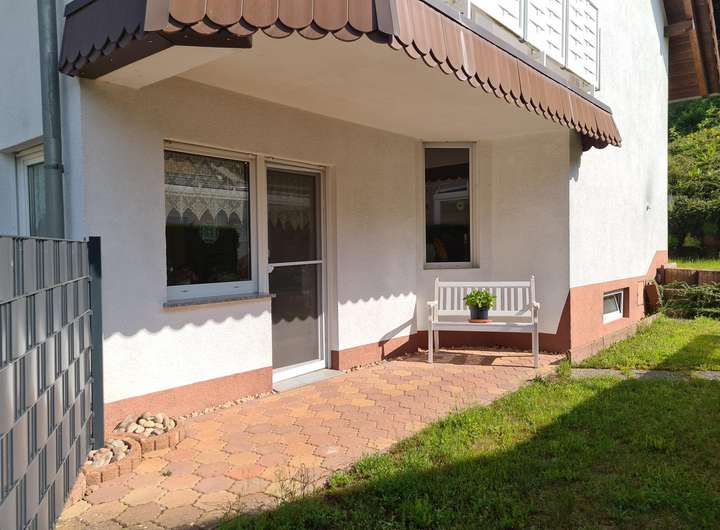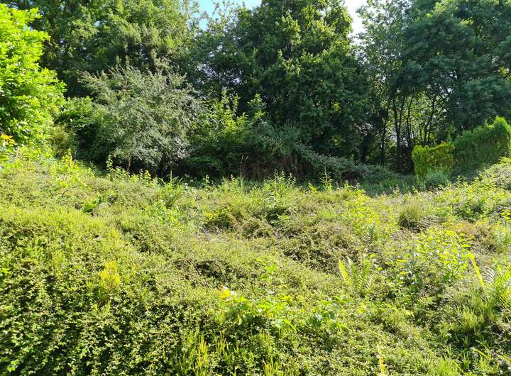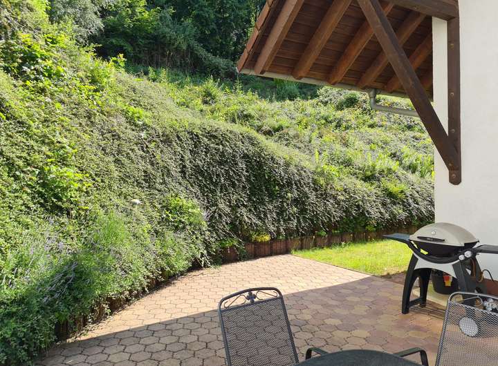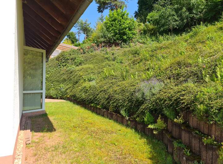 Das Grundstück ist anschließend an Haus und Terrasse als ebene Rasenfläche angelegt; zum angrenzenden öffentlichen Waldgelände hin verläuft das Grundstück stark ansteigend und ist mit Bodendeckern bepflanzt.