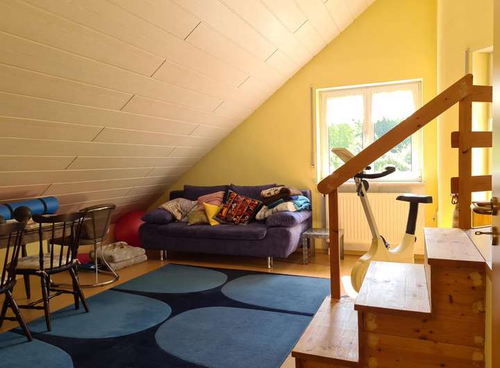 Neben dem großzügig angelegten Wohn-Ess- und Küchenbereich stehen außer verschiedenen Kellerräumen, einem Hauswirtschaftsraum, Bad und Gäste-WC insgesamt 5 weitere abgeschlossene Räume zur Verfügung, wobei die beiden Kinderzimmer im Dachgeschoß jeweils noch über eine zusätzliche Schlafempore verfügen.