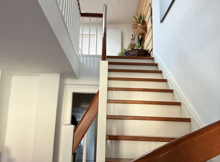 Die Böden im Erdgeschoss wurden aufgrund der verbauten Fußbodenheizung vollständig gefliest. In den Wohnräumen im Obergeschoss wurde hochwertiger Laminatboden verlegt.