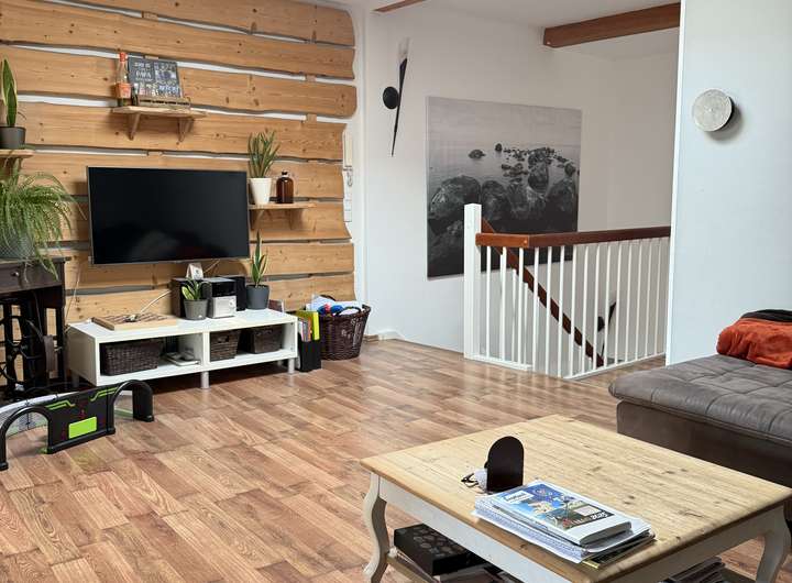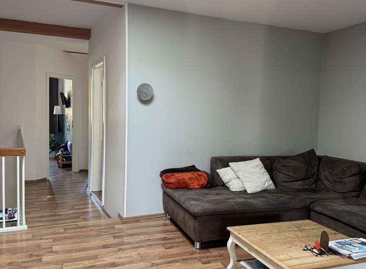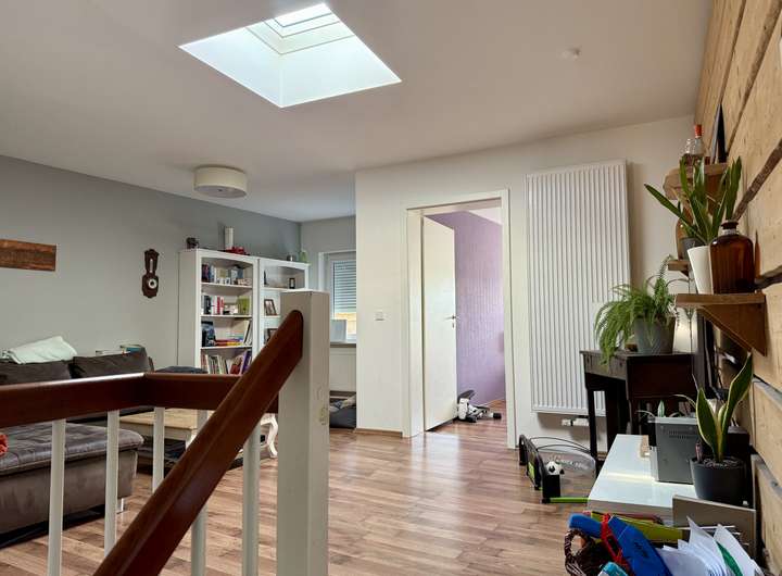 Über die offene Treppe gelangen Sie in das großzügige Wohnzimmer, welches den Mittelpunkt des Obergeschosses bildet und ausreichend Platz für das Familienleben bietet.