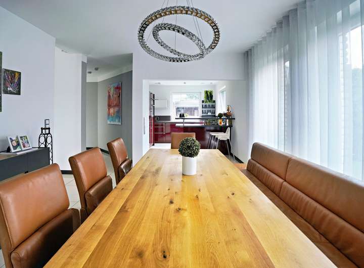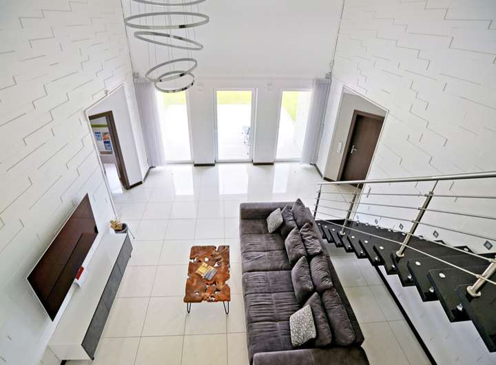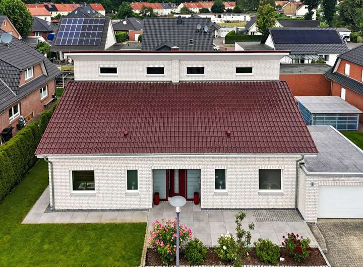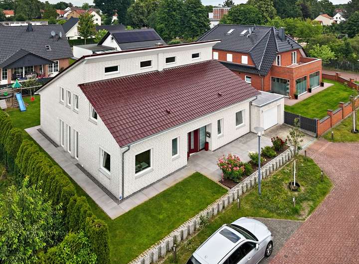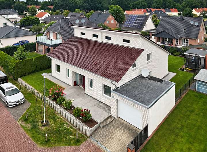 Willkommen in Ihrem neuen Zuhause in Celle – einem außergewöhnlichen Einfamilienhaus, das zeitgemäße Architektur mit hochwertiger Ausstattung verbindet. Bereits die äußere Erscheinung beeindruckt: das markante Pultdach, die helle Fassade und der stilvolle Eingangsbereich verleihen dem Haus einen modernen Charakter. Nach dem Betreten gelangen Sie in einen praktischen Windfang mit Garderobenbereich, von dem aus sich der kreisförmig angelegte Flur öffnet, der den Zugang zu den Wohnräumen elegant inszeniert. Hier finden Sie ein stilvolles Gäste-WC, das hochwertig modernisierte Hauptbad und drei vielseitig nutzbare Zimmer, die Raum für individuelle Wohnideen bieten – ob als Schlafzimmer, Homeoffice oder Gästezimmer. Am Ende des Flurs öffnet sich der weite Wohn- und Essbereich mit seiner besonderen Raumhöhe, der offenen Galerie und den großen Fensterflächen, die viel Licht hereinlassen und den Blick in den Garten freigeben. Hier setzt die neu installierte, hochwertige Kaminanlage einen stilvollen Akzent und verleiht dem Raum Behaglichkeit und architektonische Raffinesse. Die moderne Einbauküche, nahtlos in den Essbereich integriert, unterstreicht das offene Wohnkonzept und ist Teil des Angebots. Im Obergeschoss setzt sich das großzügige Wohnkonzept fort: Neben der lichtdurchfluteten Galerie finden sich weitere Räume, die vielfältige Nutzungsmöglichkeiten bieten – ob als Kinder-, Gäste- oder Arbeitsbereiche. Attraktiv ist das 2025 ausgebaute, sehr großzügige Badezimmer. Es wurde modern gefliest und vollständig vorbereitet. Die Sanitärausstattung wurde bewusst offengelassen, damit die Gestaltung und Ausstattung nach eigenem Geschmack umgesetzt werden kann - so entstehen vielfältige Möglichkeiten für eine individuelle Badgestaltung. Technisch ist das Haus auf aktuellem Stand: Eine energieeffiziente Erdwärmepumpe sorgt für nachhaltige Heiz- und Warmwasserversorgung, die Fußbodenheizung ermöglicht in allen Räumen individuell regulierbare Wohlfühltemperaturen. Hochwertige Bodenbeläge unterstreichen das gepflegte, zeitgemäße Wohnambiente. Für ein sicheres Wohngefühl sorgen eine Alarmanlage und ein Kameraüberwachungssystem. Das ca. 658 m² große Grundstück ist perfekt für entspannte Stunden im Freien. Eine großzügige, teilüberdachte Terrasse lädt zum Verweilen und Genießen ein, während Kinder viel Platz zum Spielen finden. Eine automatische Bewässerungsanlage, ein Gartenbrunnen und ein Mähroboter machen die Pflege besonders komfortabel. Die Garage mit elektrischem Tor rundet das Angebot ab. Die Immobilie befindet sich in einem ruhigen Wohngebiet in Celle. Kindergarten, Grundschule und Gymnasium sind in wenigen Minuten erreichbar, ebenso Einkaufsmöglichkeiten und Haltestellen des ÖPNV. Dieses Einfamilienhaus vereint anspruchsvolle Architektur, hochwertige Ausstattung und energieeffiziente Technik mit einem großzügigen Platzangebot. Es ist sofort bezugsfertig, bietet Spielraum für eigene Gestaltungsideen und eignet sich ideal für Familien und Paare, die Wert auf Qualität, Komfort und Individualität legen.
