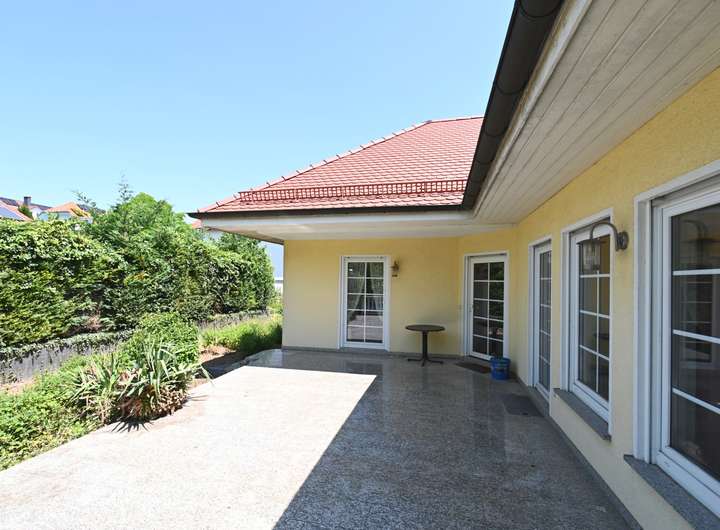 Die Hauptwohnung beeindruckt mit einer großflächigen Terrasse, die einen schönen Ausblick auf den Garten bietet und ideal für entspannte Stunden im Freien ist. Die Innenausstattung wird durch eine hochwertige Einbauküche ergänzt. Angrenzend befindet sich eine separate Speisekammer.