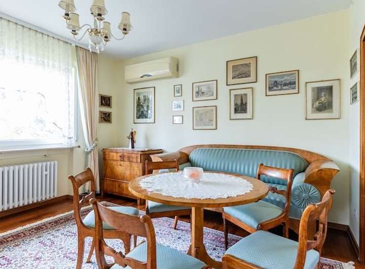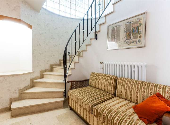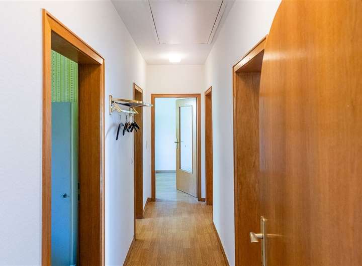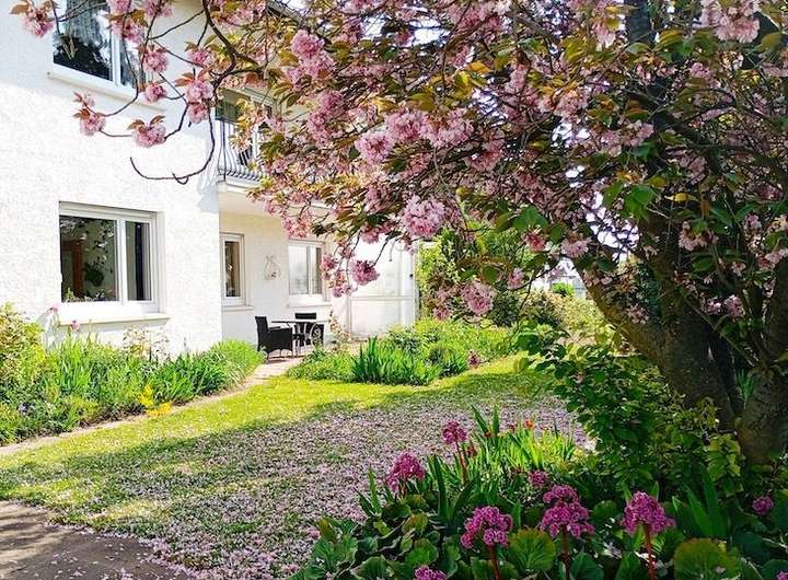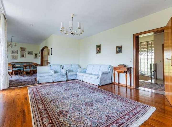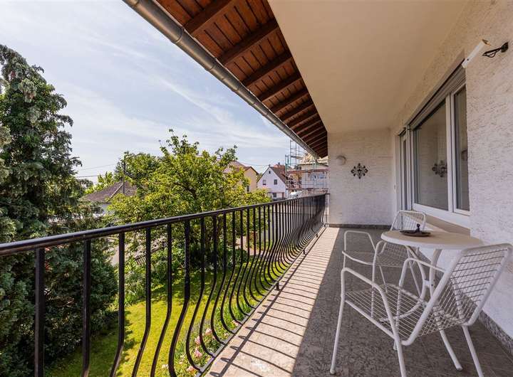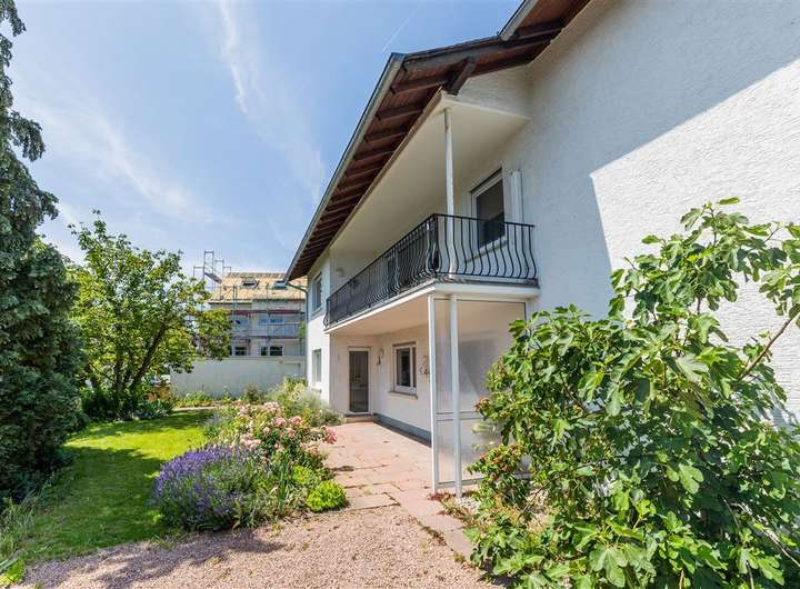 Geradeaus durch den Eingangsbereich führt der Weg weiter ins großzügige, helle Treppenhaus mit Marmorbelag, das zur Hauptwohnung im Obergeschoss sowie in die ebenerdigen Kellerräume führt. Im Obergeschoss erwartet Sie ein großzügiger, gut gegliederter Grundriss mit viel Wohnkomfort. Direkt vom Treppenhaus aus betreten Sie eine geräumige Diele, von der aus sich alle Räume erschließen. Das Gäste-WC mit Tageslicht befindet sich ebenfalls im Eingangsbereich. Die separate Küche ist direkt von der Diele zugänglich und bietet kurze Wege zum Essbereich. Das großzügige Wohn-/Esszimmer ist durch einen offenen Rundbogen verbunden und besticht durch große Fensterflächen, viel Licht sowie direkten Zugang zum überdachten Balkon mit herrlichem Fernblick über die Umgebung. Das Wohnzimmer ist mit einem hochwertigen, strapazierfähigen Mecrusse -Parkettboden ausgestattet. Der private Bereich der Wohnung umfasst ein großes Schlafzimmer mit Eichenholzparkett, zwei Kinderzimmer, ein weiteres kleines Zimmer (z. B. als Büro oder Gästezimmer), ein Ankleide-/Abstellraum sowie ein Tageslichtbad mit Badewanne und Dusche. Ein besonderes Highlight ist der ebenerdige Zugang vom Flur aus in den hinteren Gartenbereich, der sich durch die Hanglage auf Gartenniveau öffnet. Der liebevoll angelegte Garten bietet sonnige Sitzplätze – teilweise überdacht – und ist durch hohe Hecken komplett sichtgeschützt. Dank verschiedener Wege rund ums Haus hat jede Wohneinheit ihren eigenen Zugang zum Außenbereich.