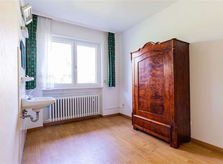 Im Erdgeschoss befindet sich eine helle, freundliche 3-Zimmer-Wohnung, die über den gemeinsamen Hauseingang zugänglich ist. Von hier aus führt der Weg rechts in die abgeschlossene Einheit, die sich hervorragend als Einliegerwohnung eignet – etwa für Familienmitglieder oder zur Vermietung. Diese Wohneinheit bietet ein gemütliches Wohnzimmer mit massivem Eichenholzparkett, ein Schlafzimmer, ein weiteres Zimmer (z. B. als Büro oder Kinderzimmer nutzbar), eine Küche mit direktem Zugang zur großzügigen Südterrasse sowie ein hochwertig modernisiertes Badezimmer. Dieses wurde 2022 umfassend renoviert und ist mit stilvollen Materialien sowie einer bodengleichen, barrierefreien Dusche ausgestattet – ideal auch für altersgerechtes Wohnen. Die Wohnung punktet durch viel Tageslicht, angenehme Raumhöhen und eine schöne Privatsphäre. Ideal für die Vermietung oder als Kombination aus Wohnen und Arbeiten im eigenen Haus.