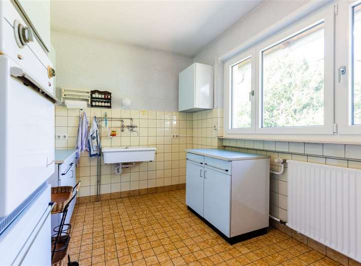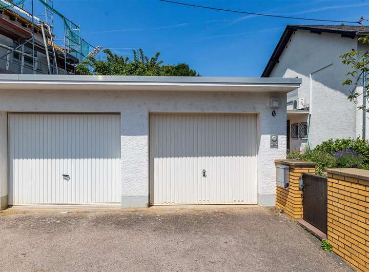Im hinteren Teil des Erdgeschosses (hangseitig) befinden sich zudem drei geräumige Kellerräume, einer davon mit direktem Gartenzugang – ideal für Werkstatt, Hobby oder Lagerung. Eine große Doppelgarage mit direktem Zugang zum Grundstück sowie zwei Außenstellplätze bieten ausreichend Platz für Fahrzeuge und Besucher.