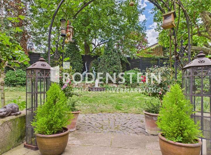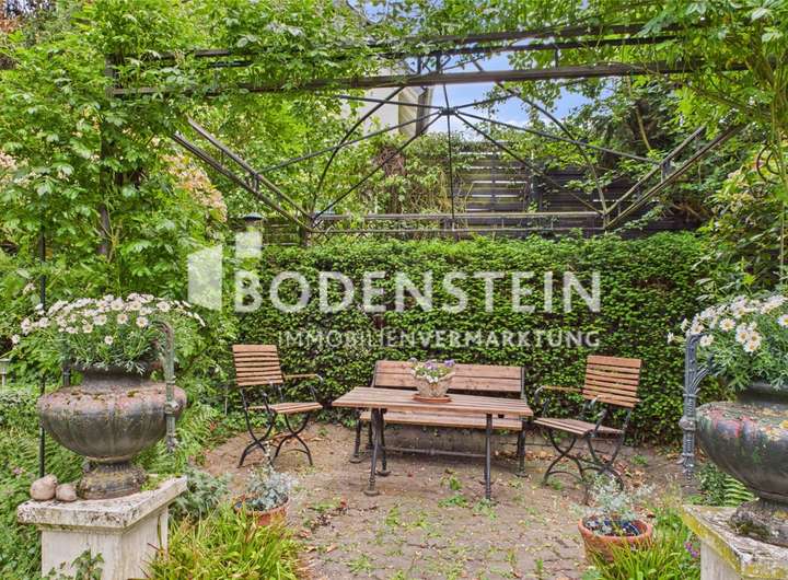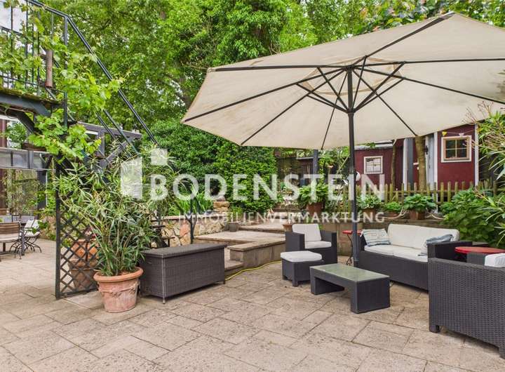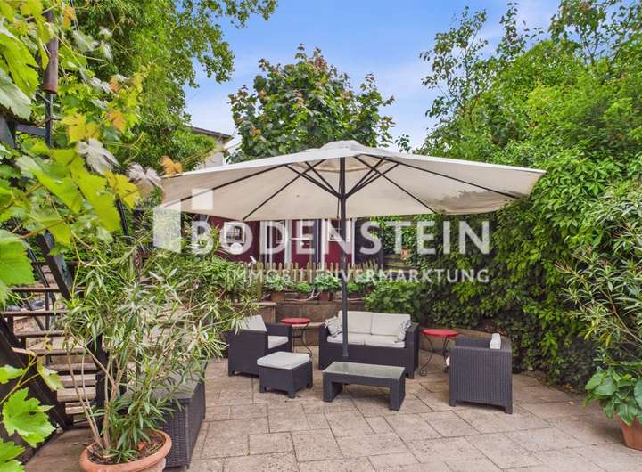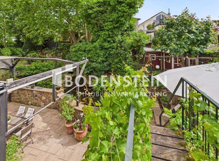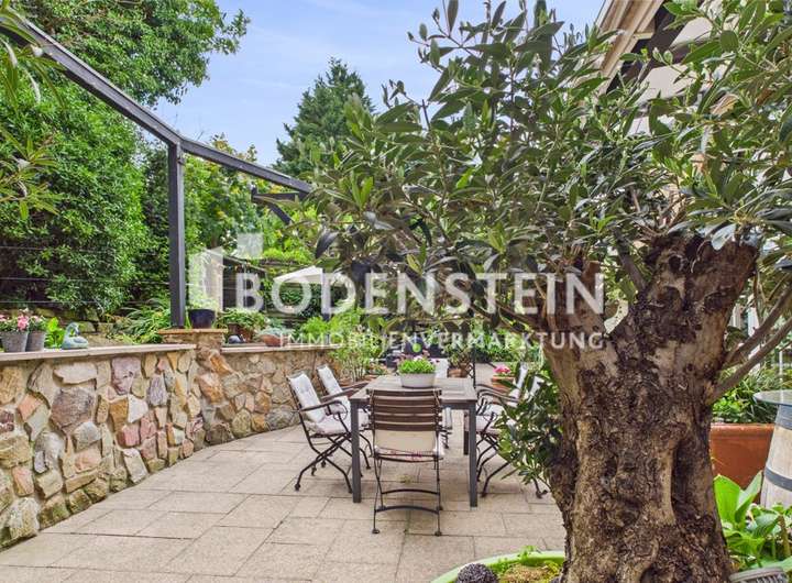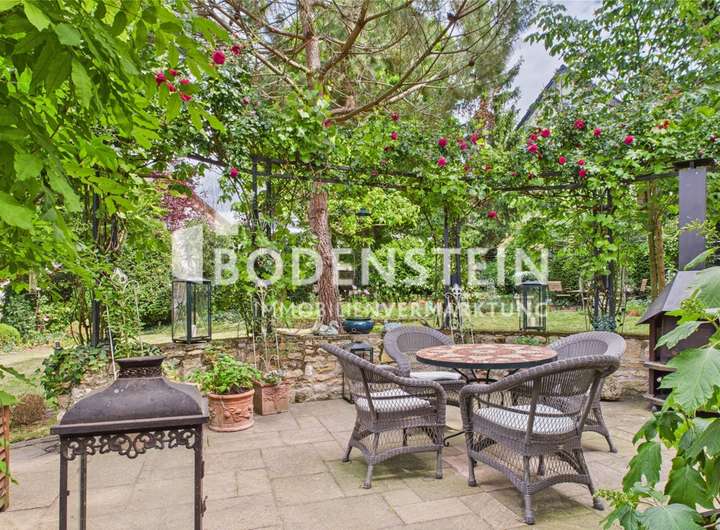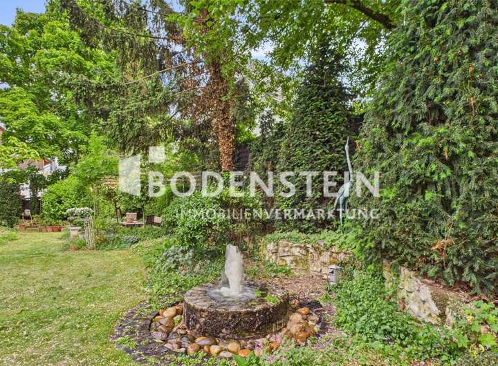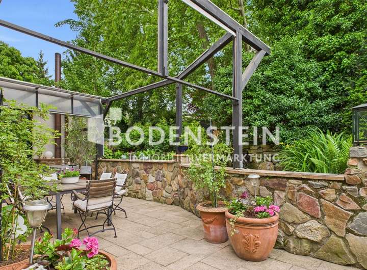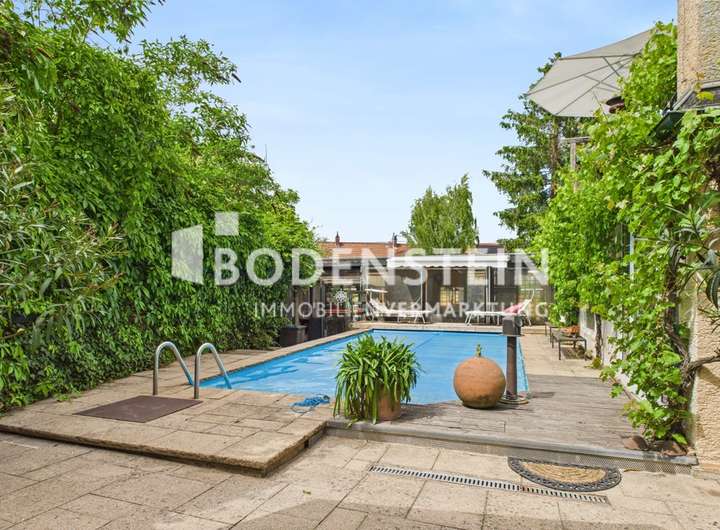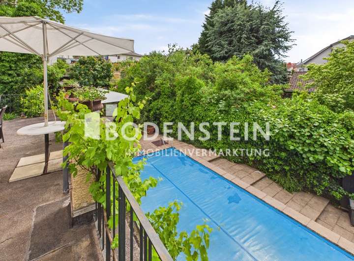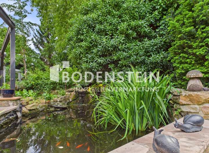Der Außenbereich gleicht einer privaten Parkanlage mit altem Grünbestand: Ein 8 × 4 m großer Pool mit Gegenstromanlage, ein idyllischer Koiteich und zwei große Terrassen machen das Grundstück zu einer Wohlfühloase. Ein 60 m² großes Carport bietet zudem Platz für mehrere Fahrzeuge.