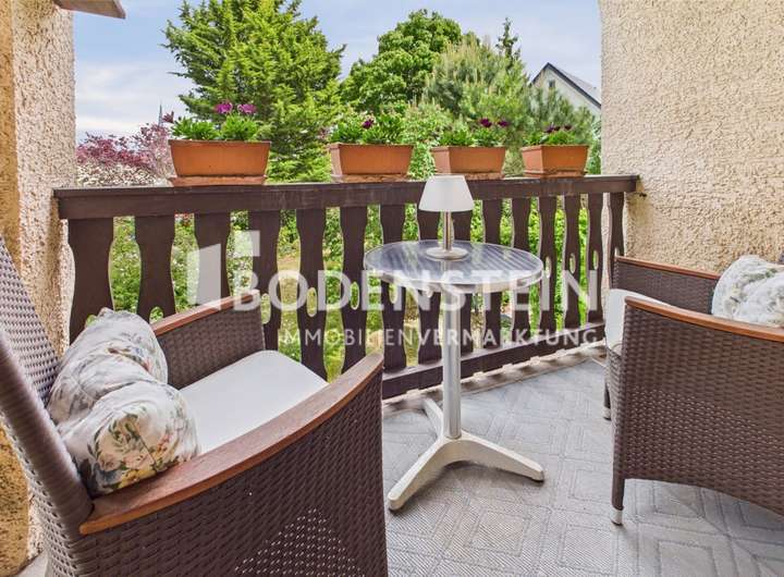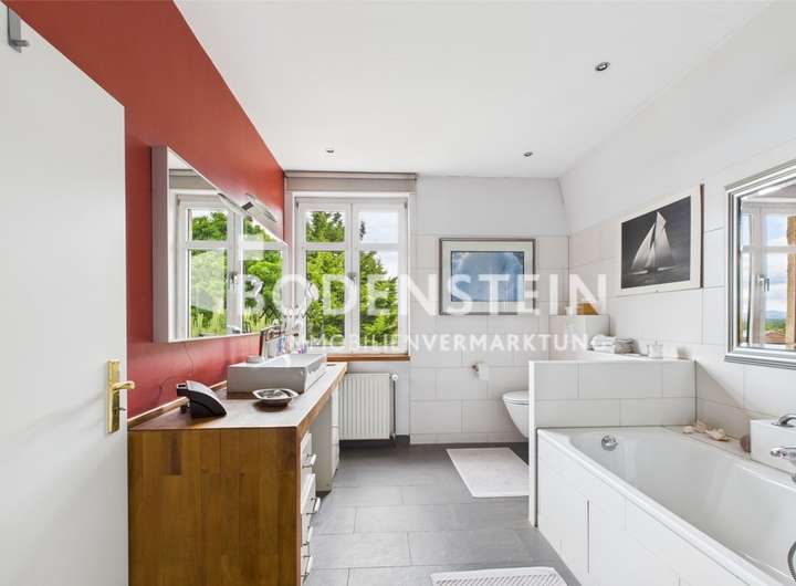 Insgesamt stehen Ihnen zehn vielseitig nutzbare Zimmer zur Verfügung – ideal für Familie, Gäste oder das stilvolle Arbeiten von zu Hause. Insgesamt fünf modernisierte Bäder sowie ein Gäste-WC bieten höchsten Komfort. Im Obergeschoss befinden sich drei ruhige Schlafzimmer, zwei Bäder, ein Wohnzimmer mit Terrassenzugang sowie ein Balkon mit Blick ins Grüne. Im zweiten Obergeschoss eröffnet sich ein separater Bereich mit zwei weiteren Zimmern, Büro, Bad und Küche – ideal auch als Gästetrakt oder für heranwachsende Kinder. Hier hat man einen wunderschönen Ausblick in Richtung Rheingau.