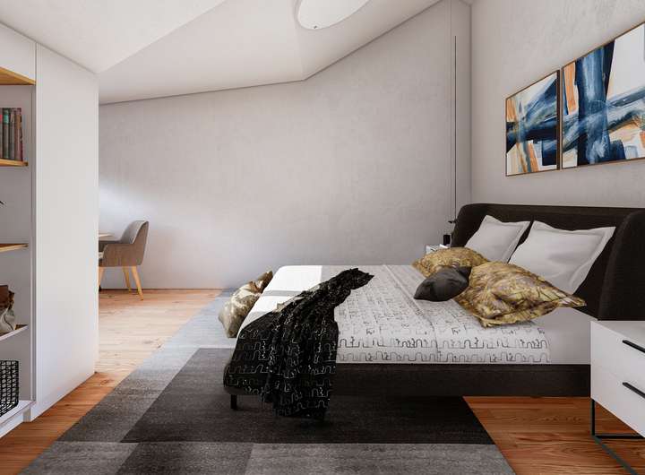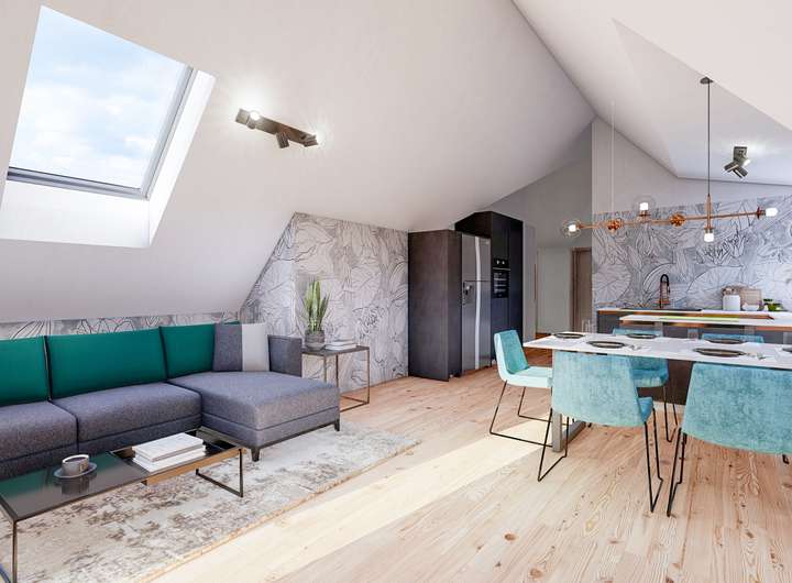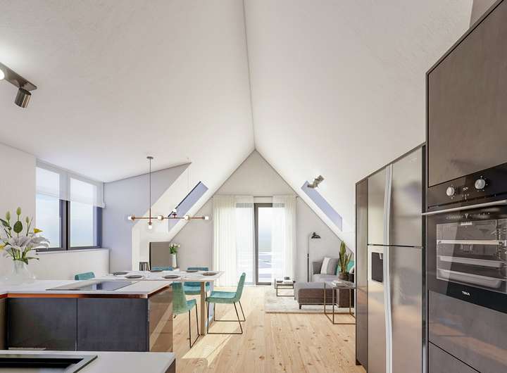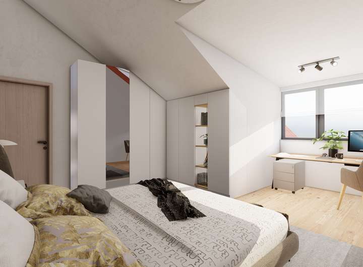Die letzte freie Wohnung befindet sich im Dachgeschoß (WE Nr. 09) und kann sofort angeschaut werden. Das DG hat einen sehr hohen Kniestock, der durchgehende Sichtholzbalken (First) erstreckt sich auf die gesamte Länge und bietet eine faszinierende Deckenhöhe mit über 3,50 Meter.