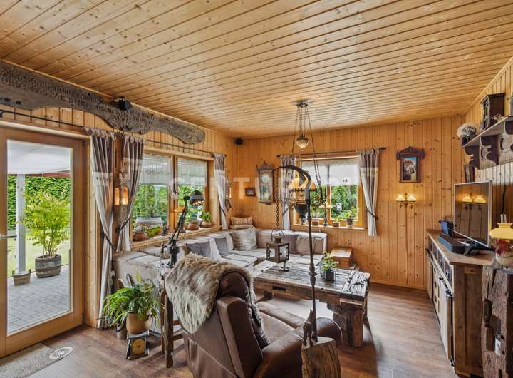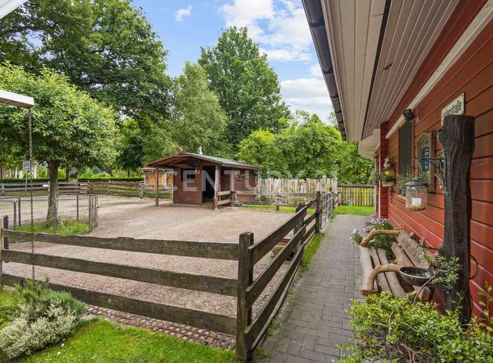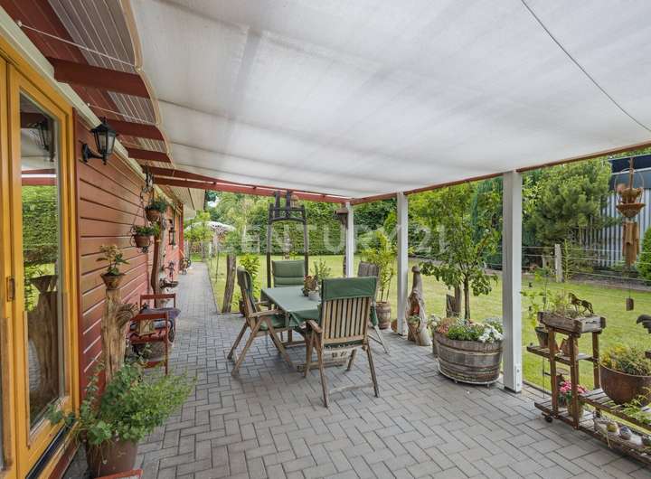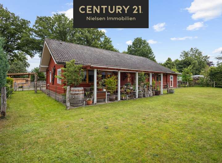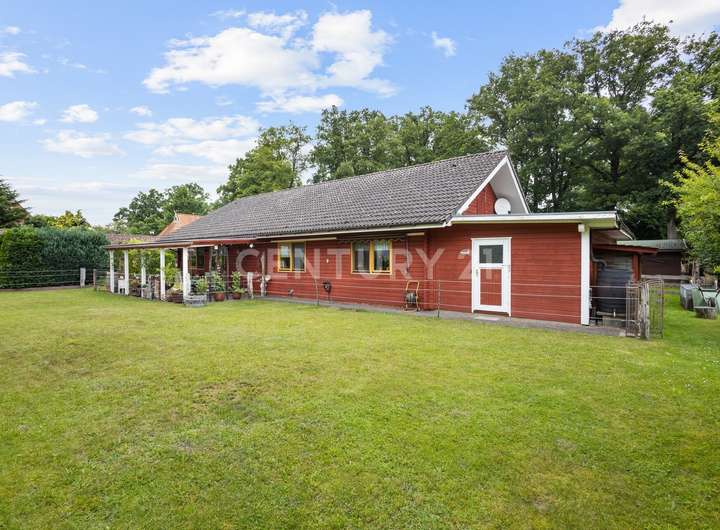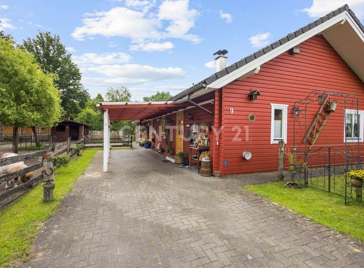 Hier präsentiere ich Ihnen eine außergewöhnlich schöne Kombination aus der Kategorie „Wohnen mit Tieren am Haus“. Das Schwedenhaus (Niedrig-Energieblockhaus) vermittelt sofort eine Grundwärme und lädt zum Verweilen ein. Es steht auf einem sonnigen 700m² großen Grundstück und verfügt über ca.153m² Wohn-Nutzfläche, die sich auf einer Ebene (inkl. Anbau) verteilen. Des Weiteren verfügt das Haus über ein Doppelcarport und einer nach Süden ausgerichteten überdachten Terrasse.