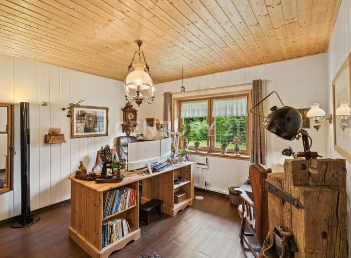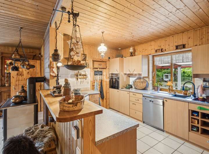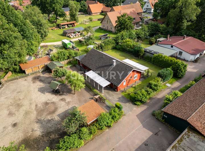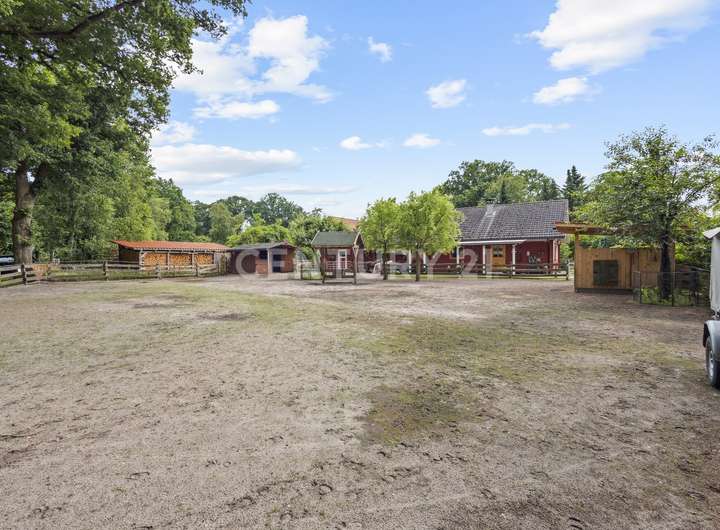 Im Inneren erwarten Sie der ganze Charme eines Schwedenhauses. Er besticht nicht nur durch seine hölzernen Wände, sondern auch durch seinen offenen Grundriss. Die lichtdurchfluteten und geräumigen Räume lassen kaum Wünsche offen. Das EG verfügt über einen großen Hauswirtschaftsraum, einen Flur, eine offene Küche, ein Vollbad mit Wanne, ein Büro, ein Gästezimmer und ein Schlafzimmer mit Blick auf den Paddock. Das Highlight ist hier aber der große, urgemütliche Wohn-Essbereich mit Zugang zur überdachten Terrasse. Hier finden Sie zudem auch den italienischen Dauerbrandofen vor. Dieser sorgt neben der Luft/Luft-Luft/ Wasser Wärmepumpe für ein angenehmes Raumklima. Das Besondere daran ist, das Sie keinen Heizkörper im Raum haben, sondern Auslässe in den Böden und Decken. In der Küche sowie dem Badezimmer haben Sie eine Fußbodenerwärmung.