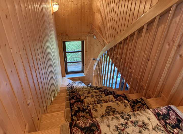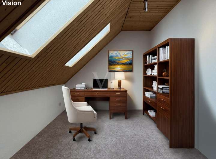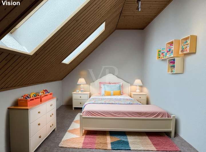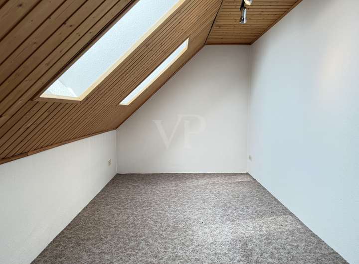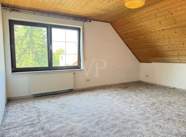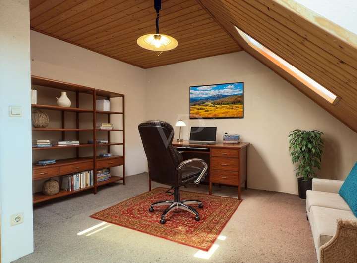 Im Obergeschoss erwarten einen drei Zimmer, die viel Raum für Familie, Gäste oder ein Homeoffice bieten. Das Badezimmer mit Blick in den Garten bringt viel natürliches Licht hinein und schafft eine freundliche Atmosphäre.