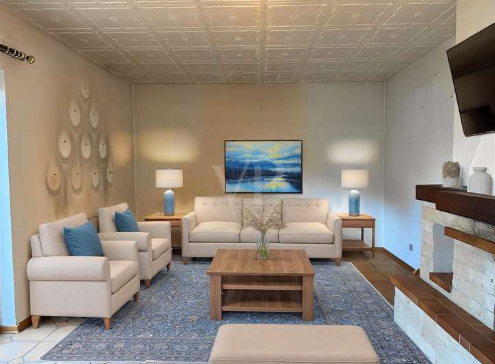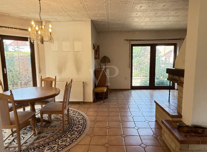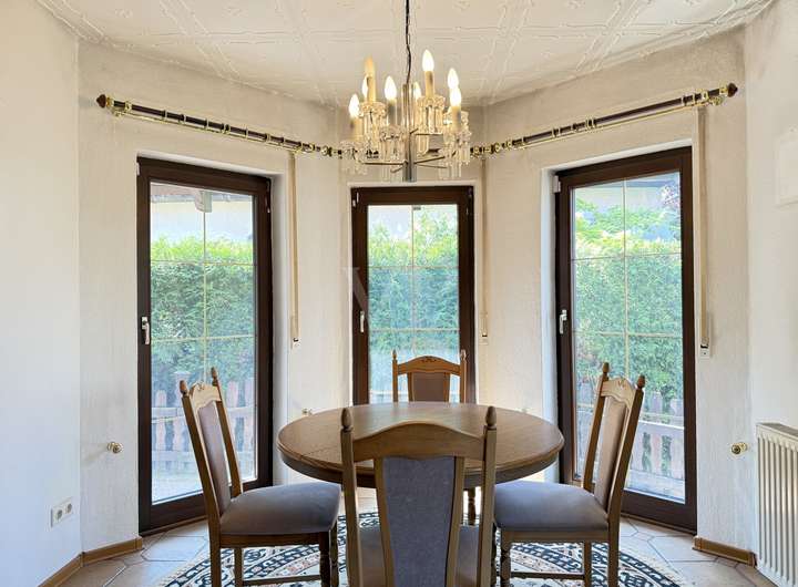 Geht man geradeaus weiter, öffnet sich der Blick: Rechts zweigt die Treppe in den Keller ab, geradeaus betritt man das gemütliche Wohn-Esszimmer. Auch wenn der Stil etwas in die Jahre gekommen ist, lädt der Raum mit seinem Kamin zu warmen Stunden ein – hier schlummert Potenzial für einen Ort voller Geborgenheit.