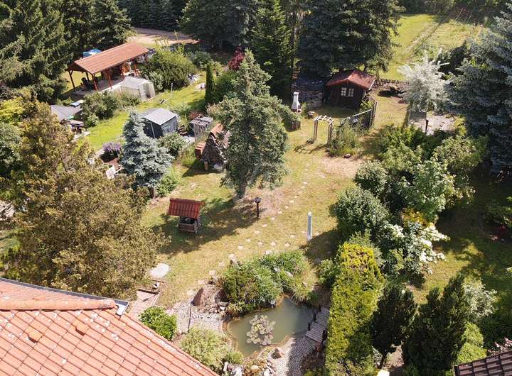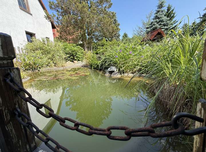 Der Garten selbst ist ein kleiner Rückzugsort – mit einem charmanten Schuppen für Gartengeräte und einem kleinen Teich, der eine besondere Note setzt. Hier ist Platz für grüne Ideen, gemütliche Nachmittage oder spielende Kinder.