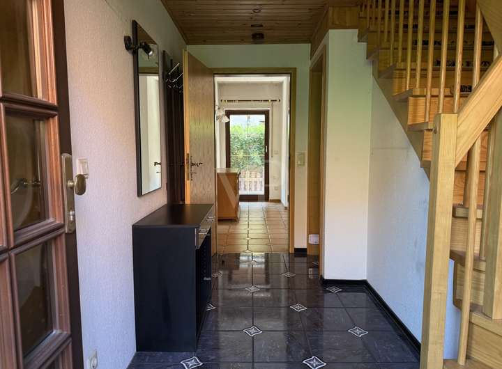 Schon beim Betreten des Hauses spürt man den ganz eigenen Charakter dieser Immobilie – ein Ort, der Geschichten erzählt und auf eine liebevolle Auffrischung wartet. Der Eingangsbereich ist klar strukturiert: Zur Linken liegt das kleine Gäste-WC, funktional und mit Tageslicht ausgestattet. Rechterhand führt eine massive Holztreppe ins Obergeschoss – ein authentisches Detail, das dem Haus seinen ursprünglichen Charme verleiht.
