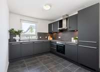 • Moderne Einbauküche: Inklusive Küchenspüle, Elektroherd und Kühlschrank – sofort einsatzbereit.