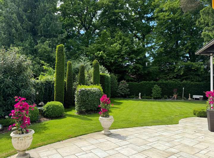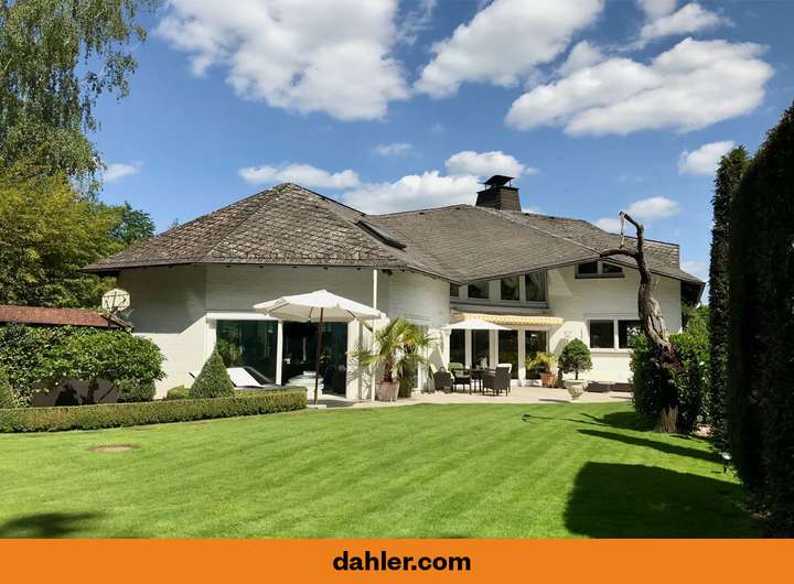 Mit einer Wohnfläche von ca. 417 m², die sich auf den Hauptwohnbereich, eine Einliegerwohnung mit separatem Eingang und einem Grundstück von ca. 1.196 m², lädt dieses Refugium zum komfortablen Leben ein und bietet eine Oase der Entspannung. Ein offener und großzügiger Wohnbereich begrüßen Sie aus dem Entrée. Der Blick in den parkähnlichen und pflegeleichten Garten über die Süd-West Terrassen ist kaum zu bezahlen.