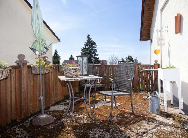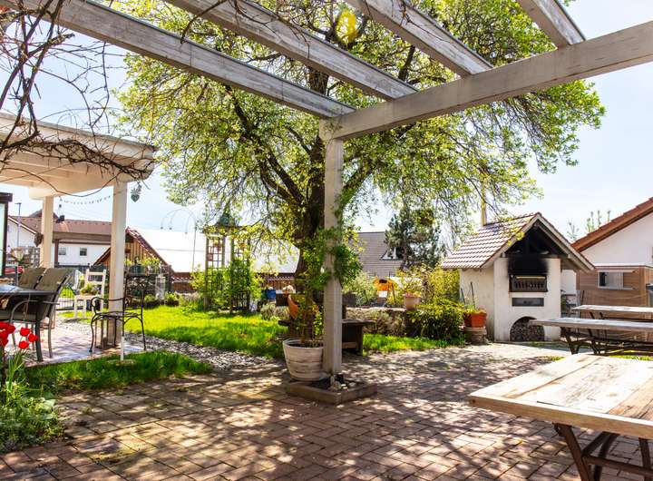 Der gepflegte Außenbereich mit zwei Terrassen und einem hochwertigen Pizzaofen lädt zum Verweilen und Genießen ein. Erweitert wird der Garten durch ein Gewächshaus, einen Hühnerfreilauf und eine Werkstatt.