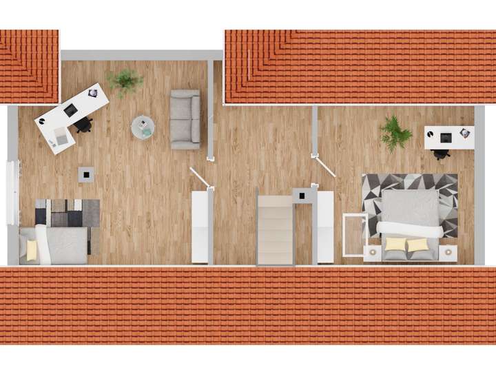 Im Dachgeschoss schafft eine offene Galerie einen großzügigen, lichtdurchfluteten Raum, der ideal als Atelier, Büro oder zusätzlicher Wohnraum genutzt werden kann. Ergänzt wird diese Ebene durch ein abgeschlossenes weiteres Zimmer, das sich als Gästezimmer oder privater Rückzugsbereich anbietet.