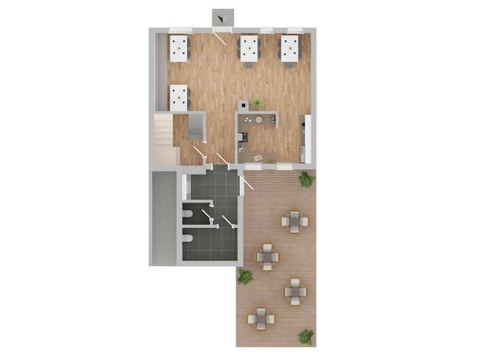 Das im Jahr 2011 hochwertig renovierte Lokal besteht aus zwei Ebenen. Im Erdgeschoss begeistert der hohe, sich über beide Geschosse erstreckende Gastraum. Die geschickt angeordnete Fensterreihe, der einladende Sitzbereich und die Theke schaffen eine gemütliche und helle Atmosphäre. Im Erdgeschoss befinden sich zudem eine funktionale Küche sowie separate Damen- und Herrentoiletten.