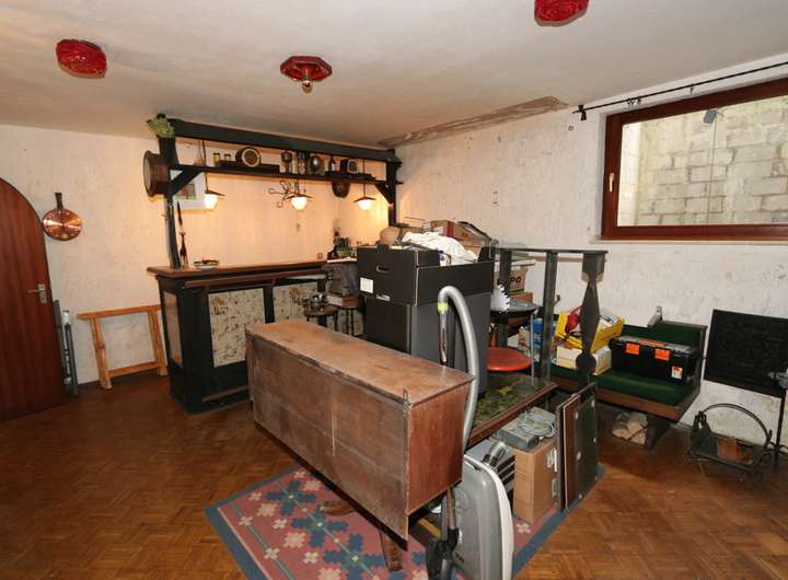 Das teilweise unterkellerte Haus bietet zusätzlich sechs Räume im Kellergeschoss, darunter ein Partykeller/Hobbyraum mit Theke, zwei hochwertig ausgebaute Räume, die ideal als Büro genutzt werden können, sowie drei Vorrats- und Lagerräume. Ein weiteres Gäste-WC und der direkte Zugang zum Garten runden das Kellergeschoss ab.