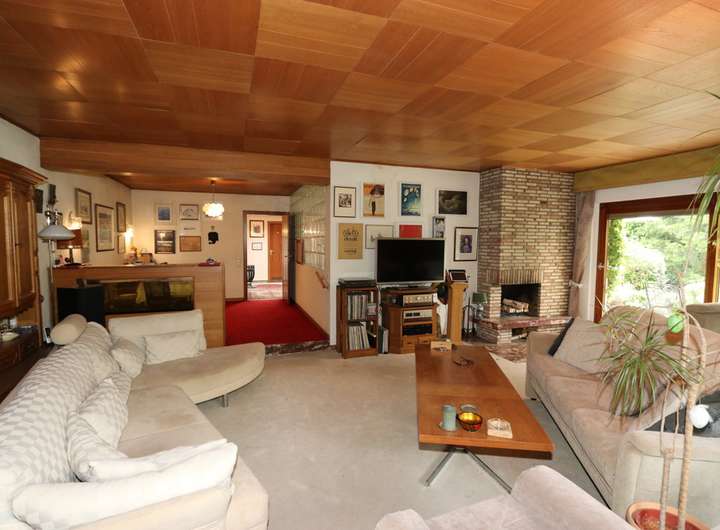 + offenes Wohnzimmer mit Essbereich und Kamin