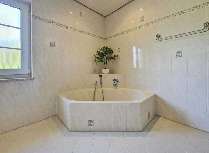 Besonders familienfreundlich: Im Erdgeschoss befindet sich ein großes Schlafzimmer mit en suite-Bad. Dieses bietet Doppelwaschtisch, Eckdusche, Eckbadewanne und Tageslicht – ideal für entspannte Morgen.