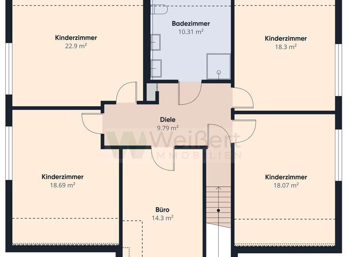 Das Obergeschoss bietet fünf flexibel nutzbare Zimmer – perfekt als Kinder-, Arbeits- oder Gästezimmer. Teilweise genießen Sie hier einen schönen Ausblick ins Grüne. Ein weiteres Tageslichtbad mit Doppelwaschtisch, Dusche sowie Waschmaschinen- und Trockneranschluss rundet das Angebot ab.