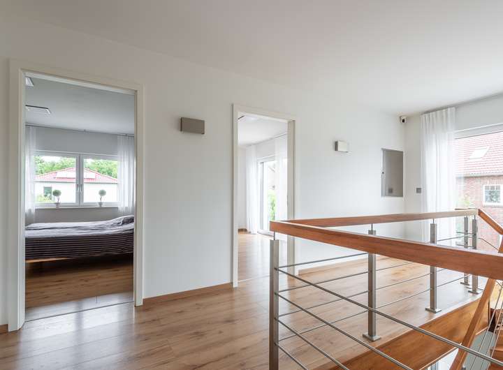 Im Obergeschoss erwartet Sie ein großzügiger Rückzugsort mit einem stilvollen Elternbad, das über eine Wanne und eine bodengleiche Dusche verfügt. Drei weitere Zimmer und ein separates Kinderbad bieten Platz für jedes Familienmitglied oder können individuell als Hobby-, Sport- oder Gästezimmer genutzt werden.