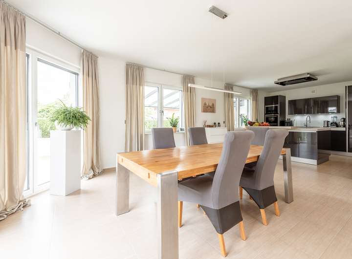 Mit rund 194 m² Wohnfläche, großzügig geschnittenen Räumen und raumhohen Fenstern bietet dieses Zuhause ein lichtdurchflutetes, offenes Wohngefühl. Der offene Wohn- und Essbereich im Erdgeschoss mit Zugang zur teilüberdachten Terrasse bildet den Mittelpunkt des Hauses und ist perfekt für entspannte Stunden im Grünen. Die hochwertige Küche mit Kochinsel und Markengeräten lädt zum Kochen und Genießen ein.