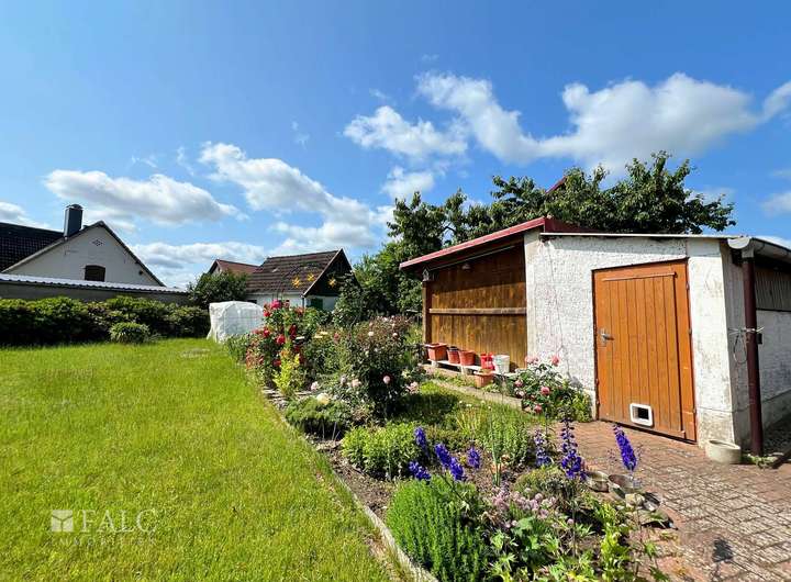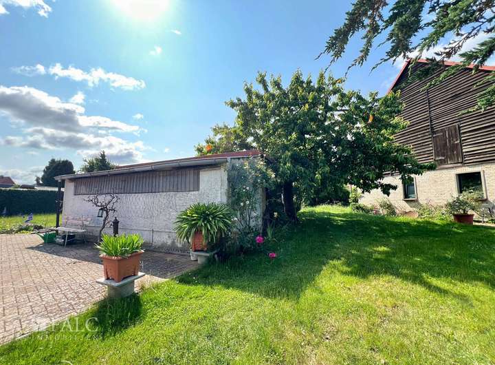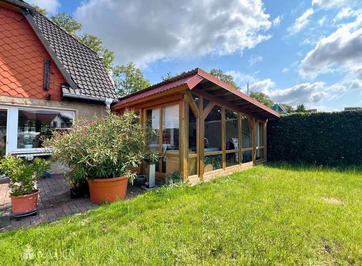 Die Küche ist mit einer großen, funktionalen Einbauküche ausgestattet und bietet genügend Platz für gemeinsame Kochabende. Das Badezimmer ist mit einer ebenerdigen Dusche versehen und liegt in einem kleinen Anbau, der Ihnen zusätzlichen Stauraum oder praktische Nutzflächen bietet. Von dort aus erreichen Sie ebenfalls die Terrasse und den weitläufigen Hofbereich. Ein Highlight im Außenbereich ist der geschützte Wintergarten, der auch an kühleren Tagen ein angenehmes Verweilen ermöglicht. Vom Wintergarten aus gelangen Sie direkt in die angrenzende Garage, die derzeit als Werkstatt, Lagerfläche und Abstellraum genutzt wird.