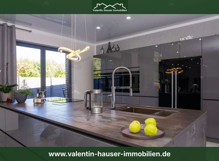 Highlights wie eine hochwertige Einbauküche, stilvoller Kamin, Solarthermie, smarte Haustechnik und programmierbare Beschattungssysteme sorgen für nachhaltigen Wohnkomfort. Der gepflegte Garten mit zwei Terrassen, automatischer Bewässerung und Mähroboter rundet das Bild ab.