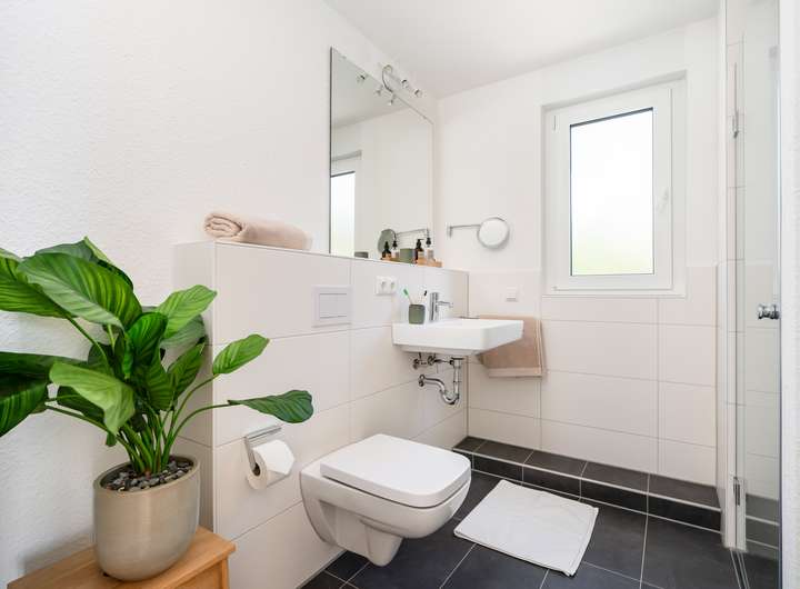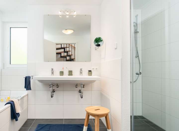 • Komfortable Badausstattung: Die bodengleiche geflieste Dusche mit Echtglastrennwänden und Spiegel in allen Bädern sowie eine moderne Sanitärausstattung und einem Doppelwaschtisch im Hauptbad bieten höchsten Komfort und Funktionalität.