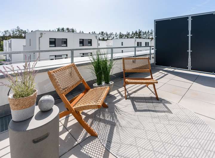 • Einladender Außenbereich: Große Terrasse mit Sichtschutz und angelegtem Garten (Rollrasen) für entspannte Stunden im Freien.