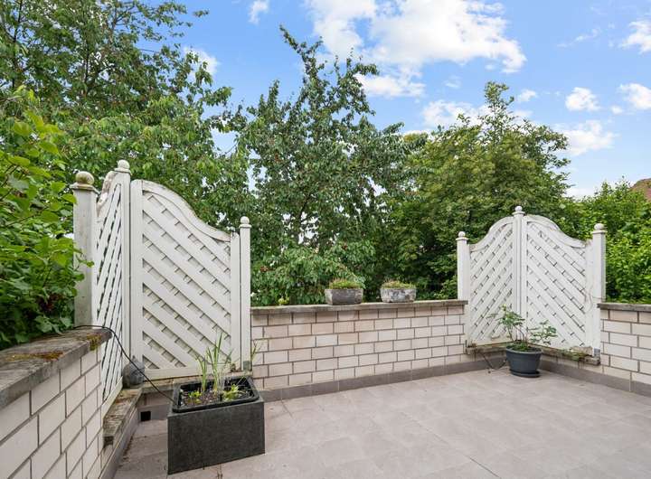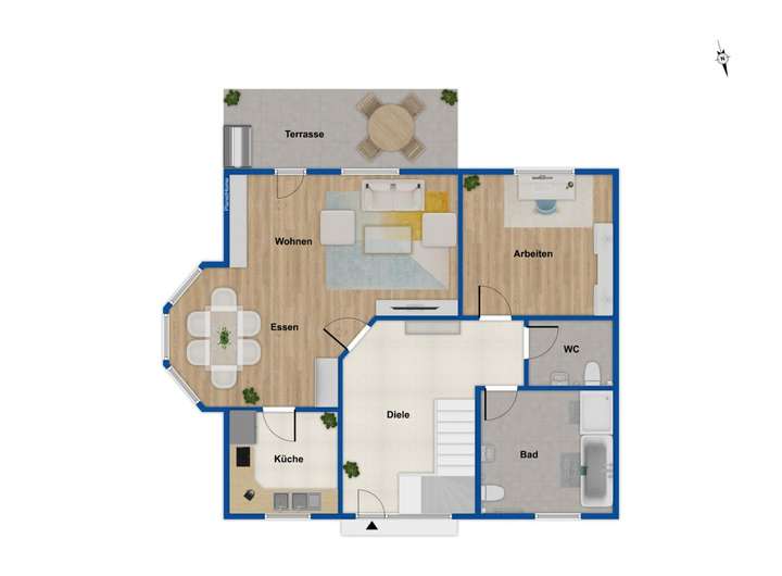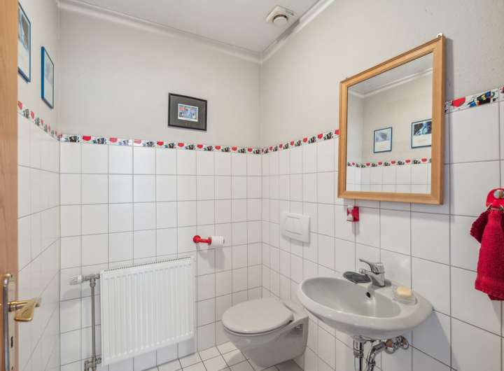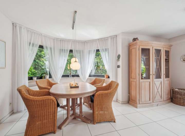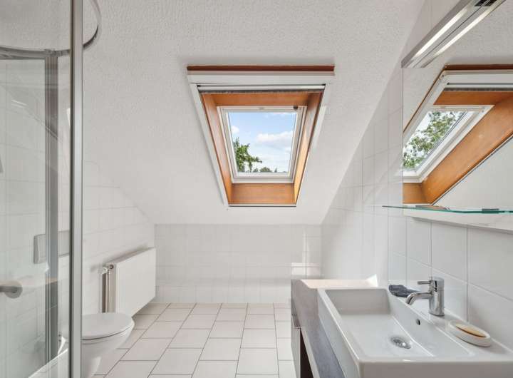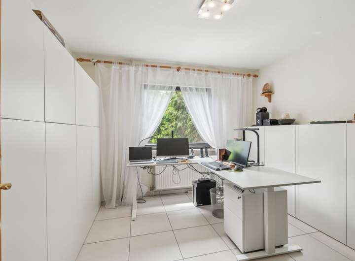 Im Erdgeschoss erwartet Sie ein heller Wohn-Essbereich mit Zugang zur großen Südterrasse, eine gepflegte und moderne Einbauküche aus dem Jahr 2014 sowie ein Arbeits- bzw. Gästezimmer, großzügiges Bad, Gäste-WC und Diele. Im Obergeschoss befinden sich zwei sehr große Schlafzimmer – jeweils mit begehbarem Ankleidebereich – sowie ein weiteres Tageslichtbad.