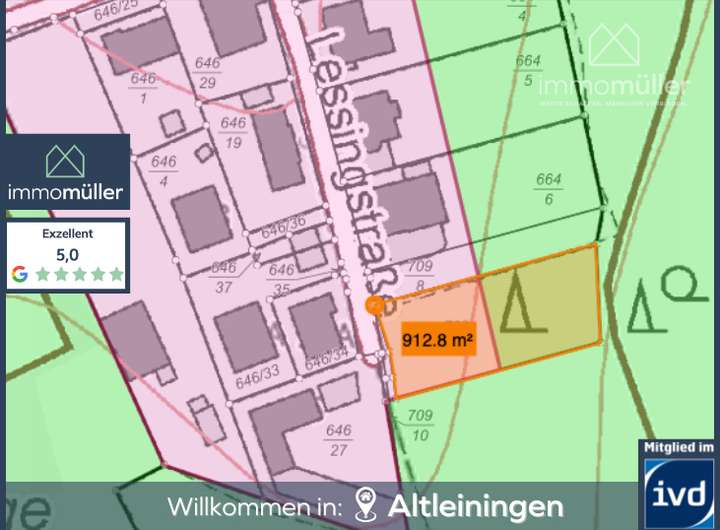 Auf dem hier zum Verkauf angebotenen Grundstück Flrst. 709/11 (Lessingstraße) mit einer Größe von ca. 912 m² dürfen Sie eine Fläche mit ca. 462 m² bebauen. Das Grundstück ist in einer Hanglage eingebettet. Ein Bebauungsplan liegt vor. Die restliche Fläche von ca. 450 m² dient der Fläche zur Erhaltung von Bäumen und Sträuchern.Es sind 2 Wohneinheiten möglich. TH 7,5m und FH 12,0m. GRZ 0,3 und GFH 0,6.