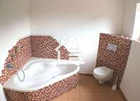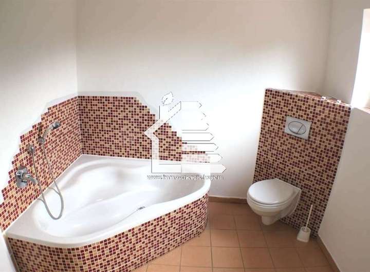 Das hell geflieste Tageslichtbad ist mit Eckwanne und Dusche ausgestattet.