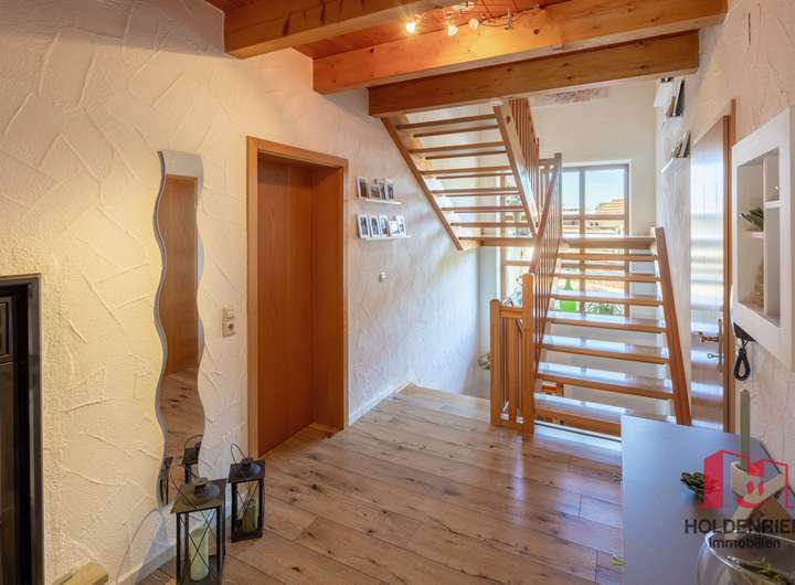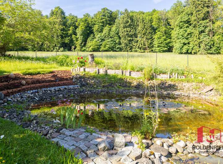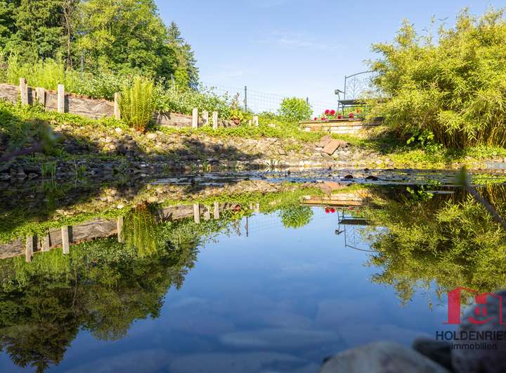 Schon beim Betreten spüren Sie, dass die jetzigen Bewohner ihr Haus lieben und es hegen und pflegen. Hier passt einfach alles und der wunderschöne Garten kann nicht besser wirken. In den Sommermonaten wird dieser zum erweiterten Wohnzimmer. Im hinteren Teil des Gartens versteckt, gibt es einen Teich, der durch seine Artenvielfalt idyllisch und sehr harmonisch wirkt. Auf der Rückseite der Garage wurde sinnigerweise ein Unterstand für das Brennholz geschaffen. Gleichzeitig bietet dieser gepflegte Platz Raum für eine Bank und einen Strandkorb. So lässt sich in den Abendstunden, mit einem Blick über den Teich, der Sonnenuntergang genießen.