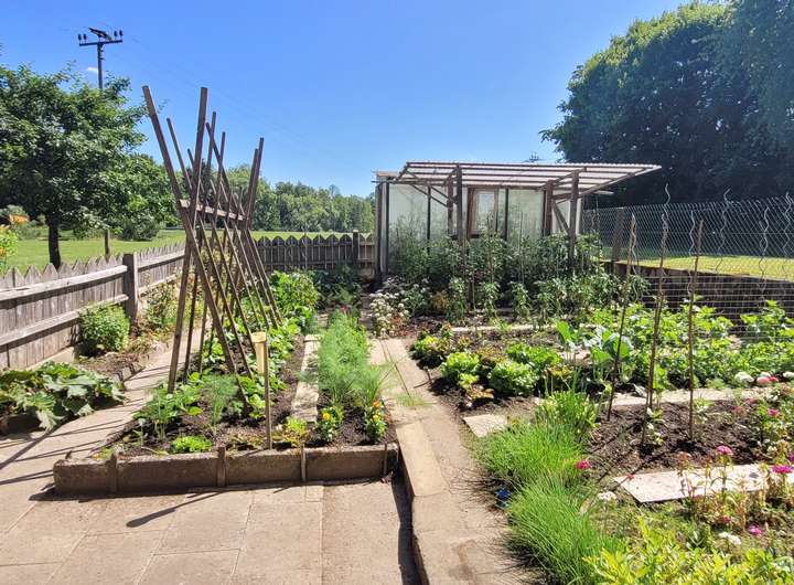 Der Garten bietet einen großen Schwimmteich, einen Bauerngarten, ein hübsches Gartenhaus, einen großen Obstbaumbestand und einen gepflegten Gemüsegarten.