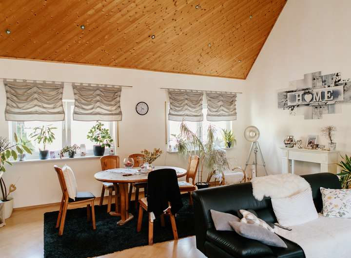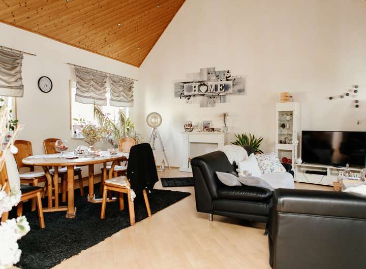 DG: Großer und lichtdurchfluteter Wohnbereich, Küche, Schlafzimmer, kleines Bad und zwei weitere Zimmer.