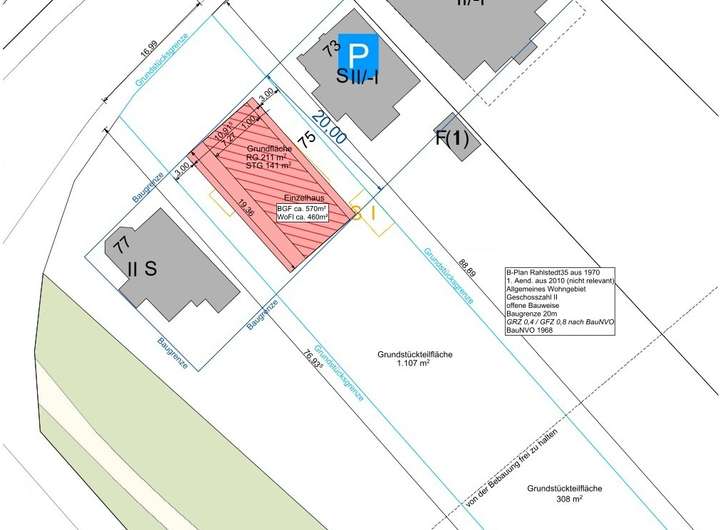 Zum Verkauf steht ein Baugrundstück in Hamburg-Rahlstedt mit einer Gesamtgröße von ca. 1.417 m², gelegen im Geltungsbereich des Bebauungsplans Rahlstedt 35 aus dem Jahr 1970. Das Grundstück liegt in einem allgemeinen Wohngebiet (WA) mit offener Bauweise und einer zulässigen Geschosszahl von zwei Vollgeschossen. Die 1. Änderung des Bebauungsplans von 2010 betrifft dieses Grundstück nicht.
